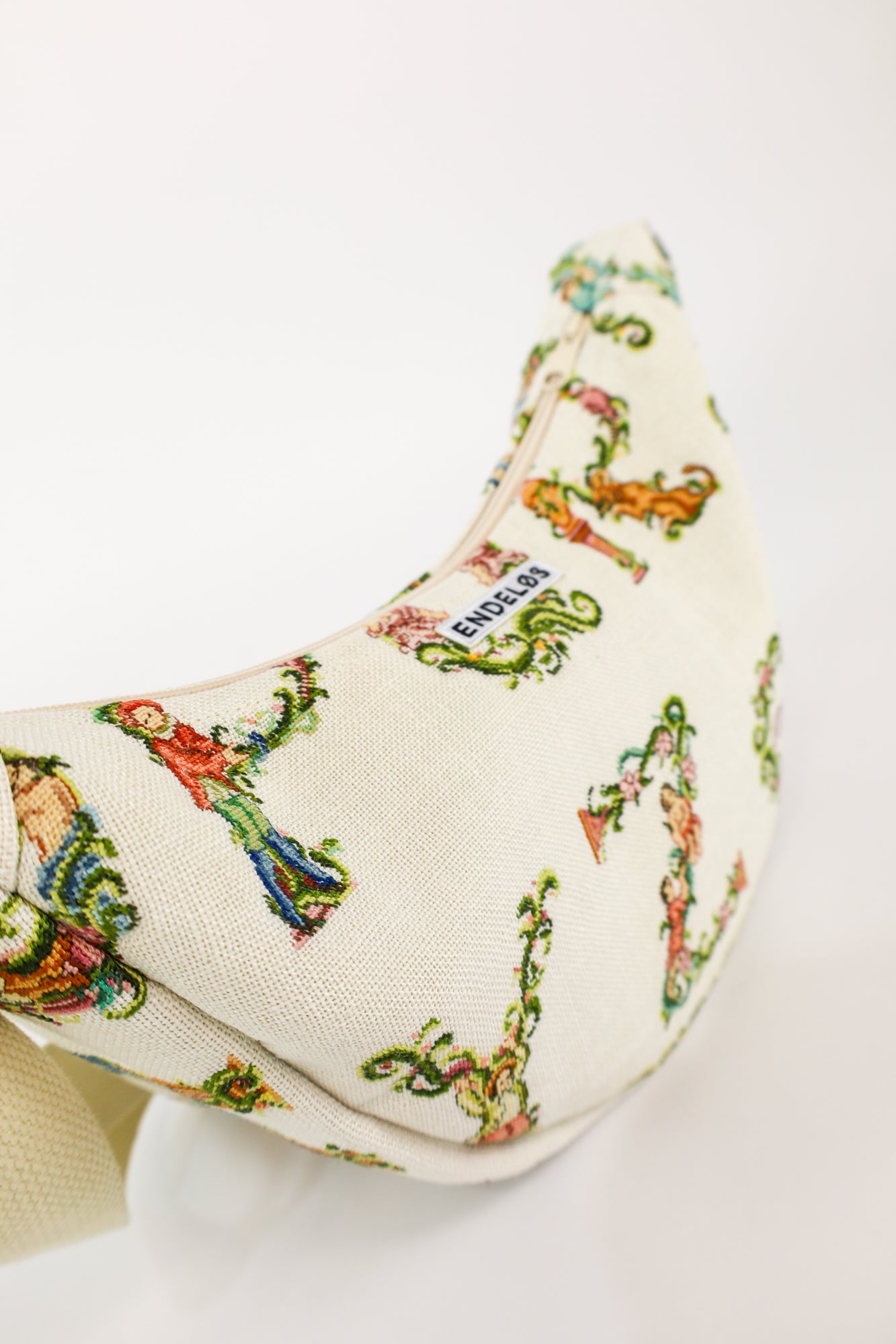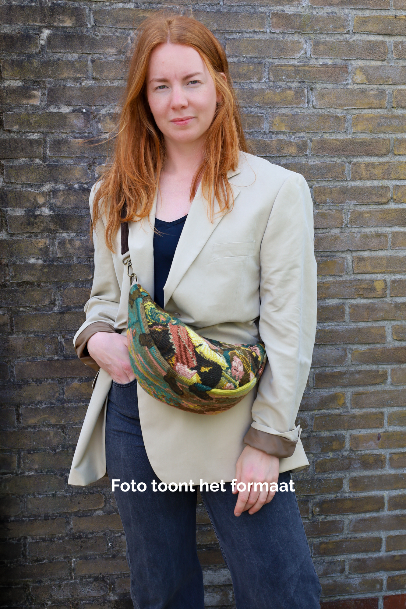 Deze unieke crossbody bag is een echte eyecatcher en volledig handgemaakt van een geborduurd schilderij, gecombineerd met gerecyclede materialen zoals tweedehands gordijnen, vintage meubelstoffen en restpartijen. Elke tas is hierdoor one of a kind en heeft een karakteristieke, stijlvolle uitstraling.