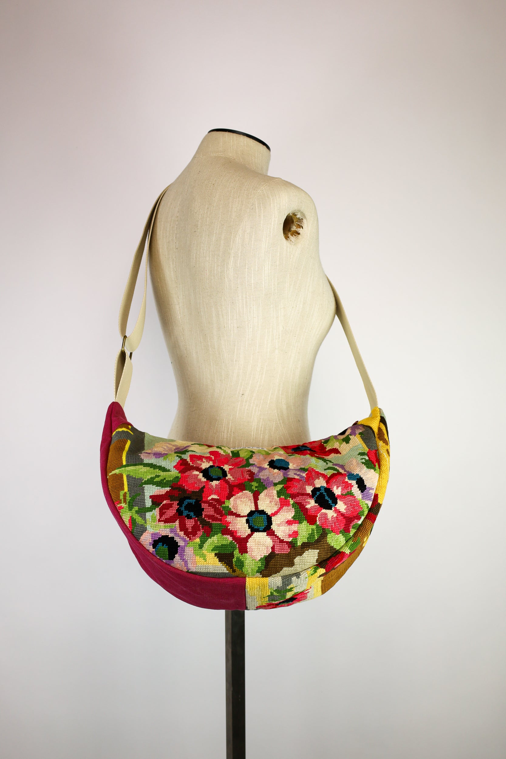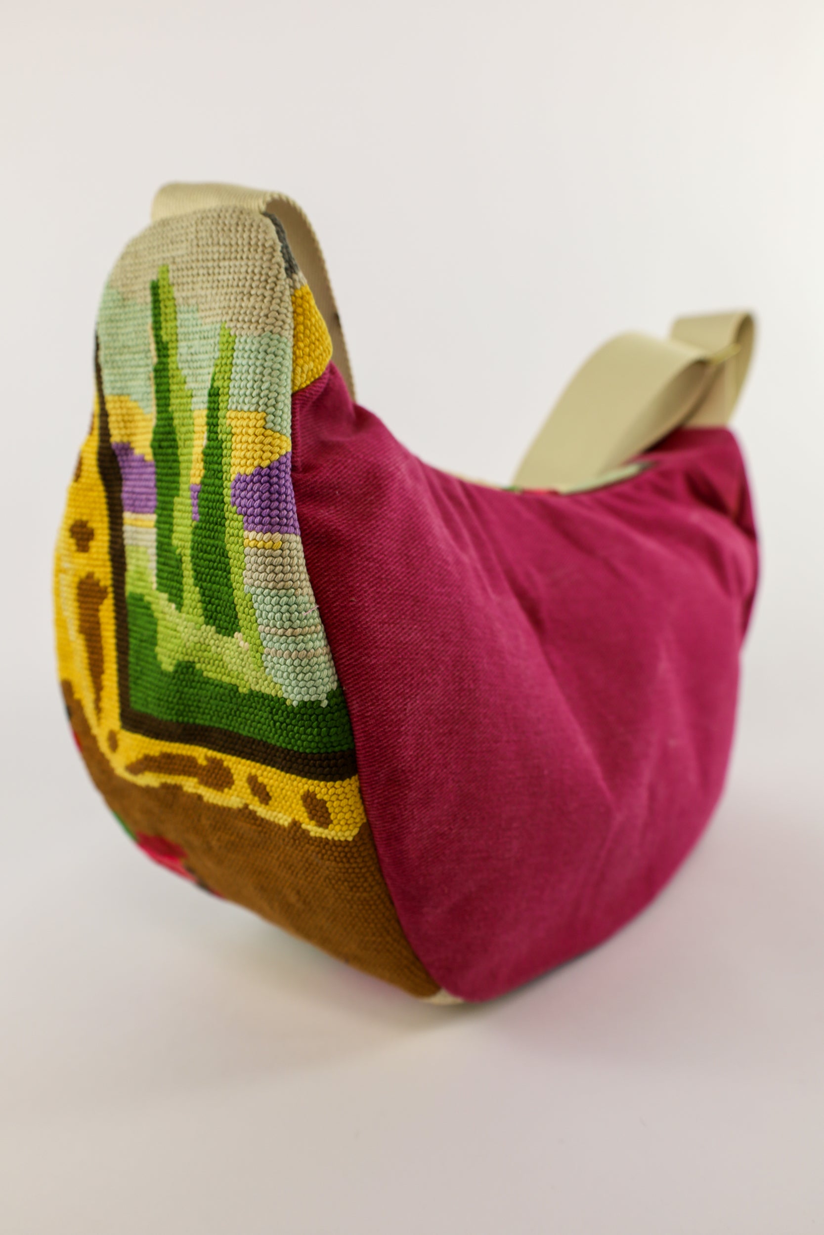 Het prachtige bloemenborduurwerk van deze tas is afkomstig uit Griekenland – een bijzonder en kleurrijk exemplaar dat direct in het oog springt. De tas is volledig vervaardigd uit dit unieke borduurwerk, wat haar een onderscheidende en authentieke uitstraling geeft.