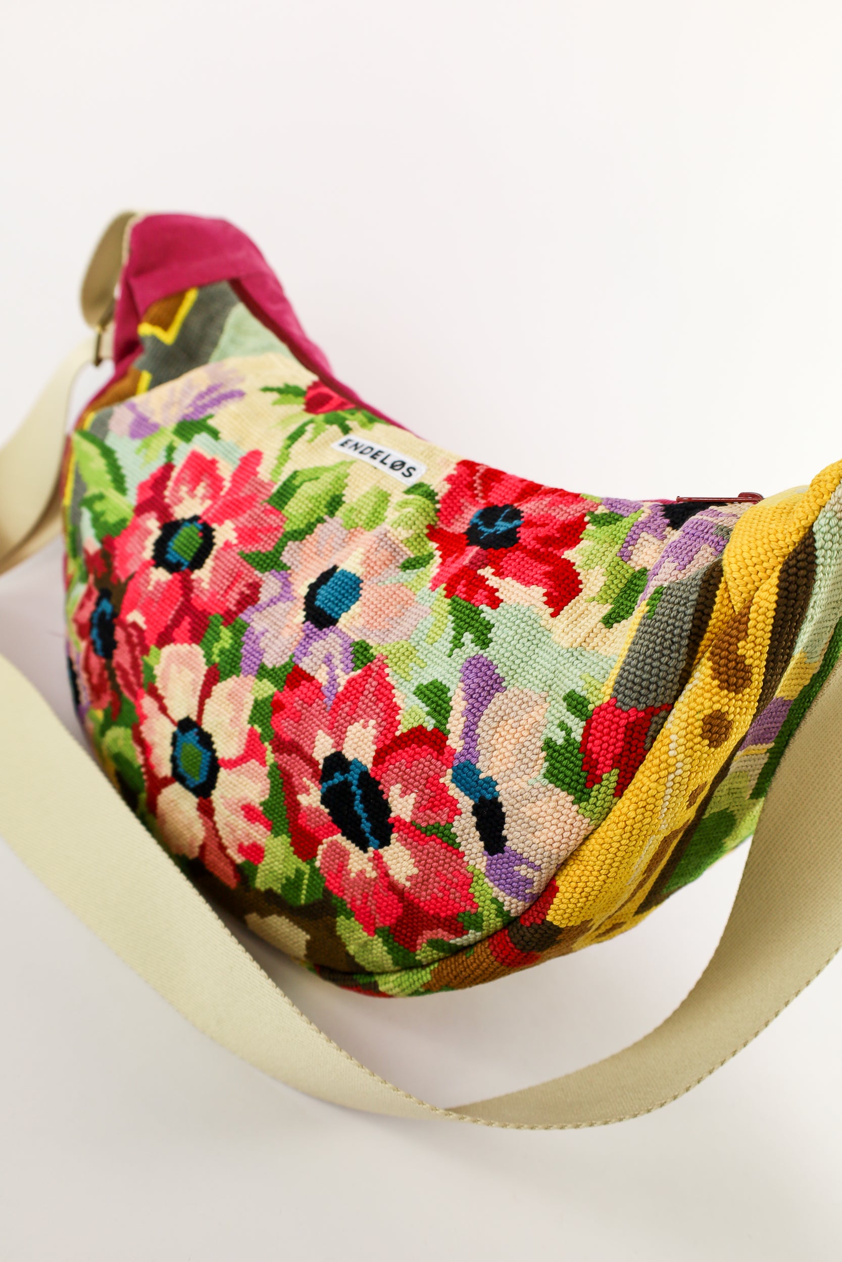 Deze L crossbody bag is een echte eyecatcher, volledig handgemaakt van oude borduurwerken in combinatie met gerecyclede materialen zoals tweedehands gordijnen, vintage meubelstoffen en restpartijen. Elke tas is daardoor uniek en heeft een geheel eigen karakter.
