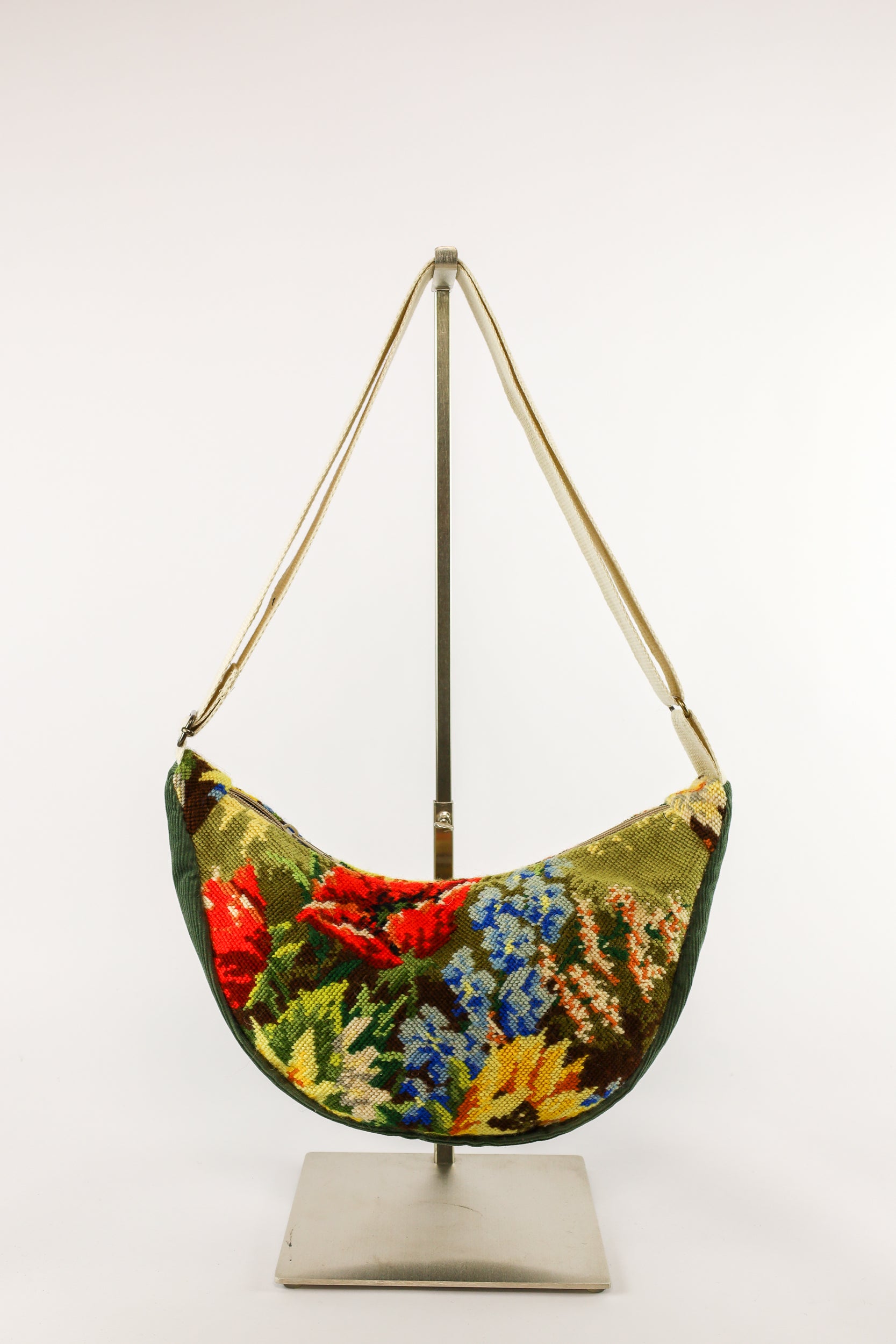 Deze crossbody bag M is een echte eyecatcher, volledig handgemaakt van oude borduurwerken in combinatie met gerecyclede materialen zoals tweedehands gordijnen, vintage meubelstoffen en restpartijen. Elke tas is daardoor uniek en heeft een geheel eigen karakter.