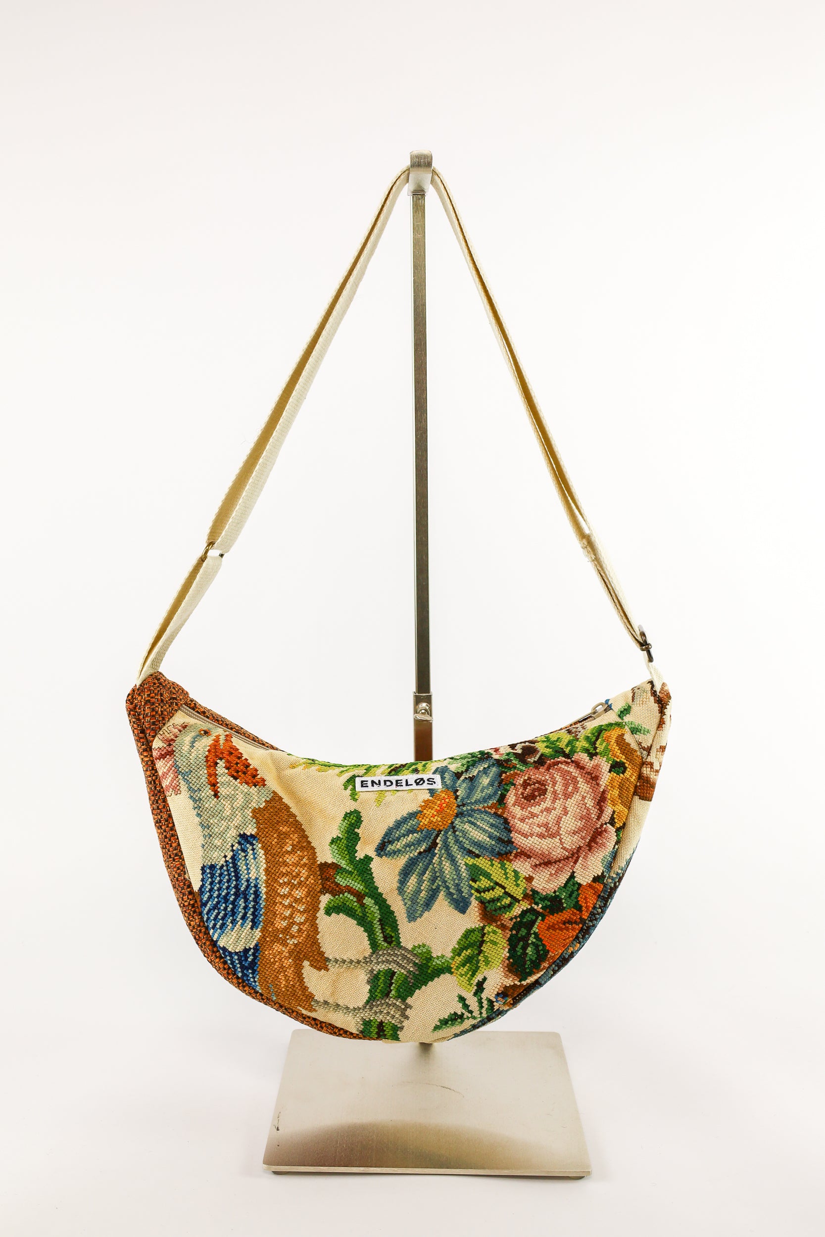 Deze crossbody bag M is een echte eyecatcher, volledig handgemaakt van oude borduurwerken in combinatie met gerecyclede materialen zoals tweedehands gordijnen, vintage meubelstoffen en restpartijen. Elke tas is daardoor uniek en heeft een geheel eigen karakter.