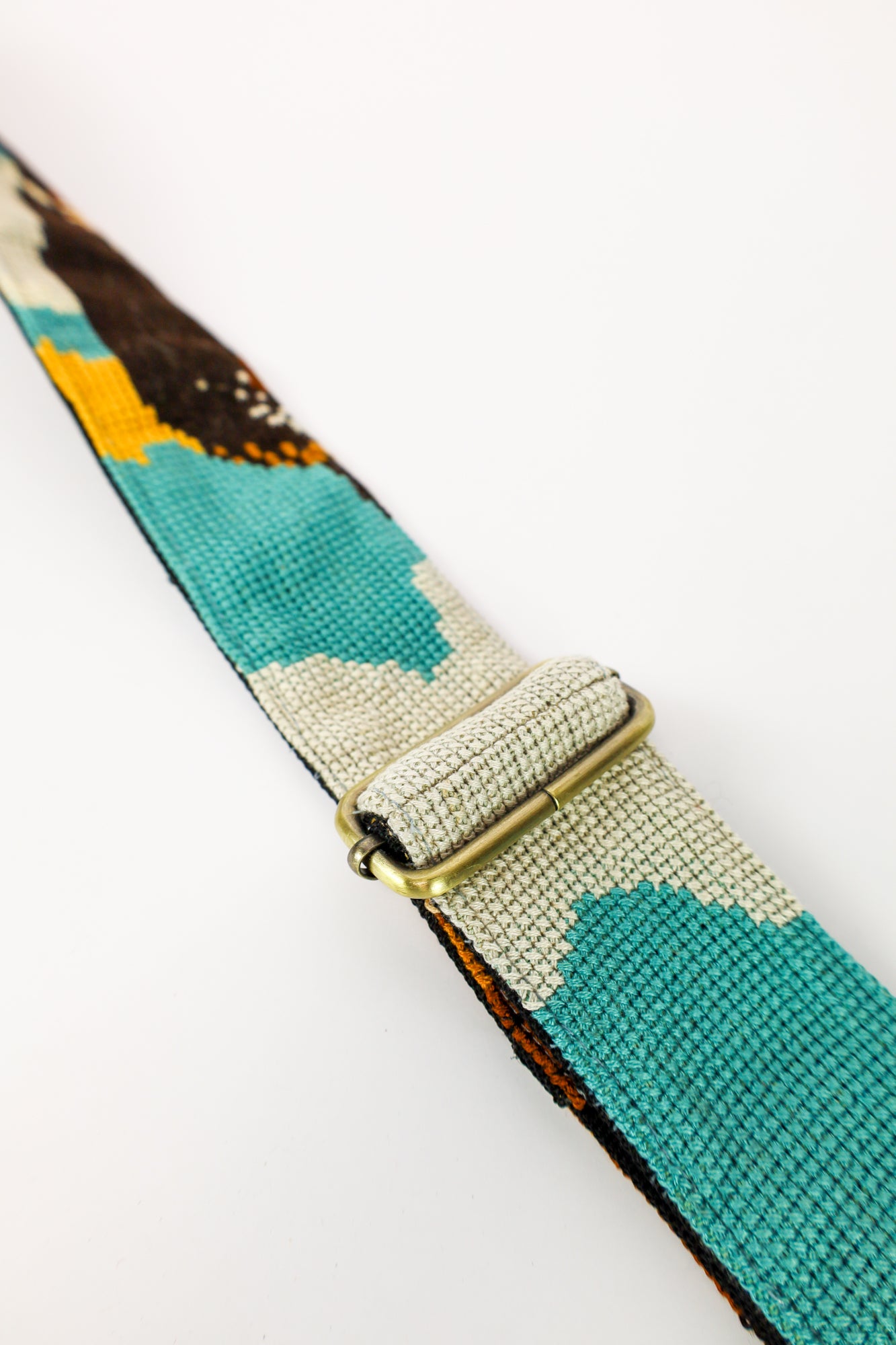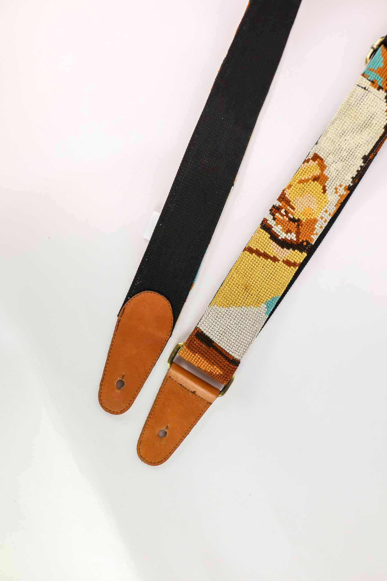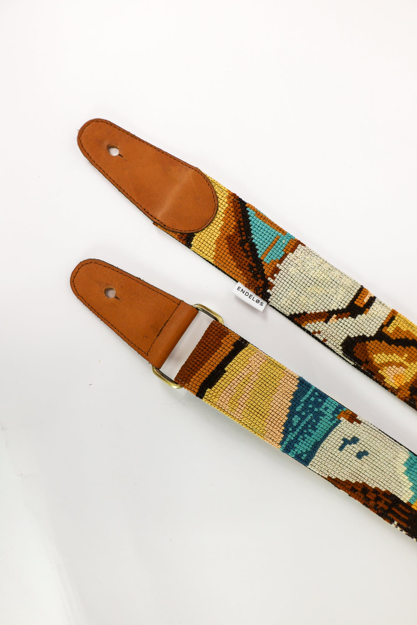 Deze gitaarband is gemaakt van een prachtig kleurrijk geborduurd schilderij, en het kunstwerk is in zijn volle glorie terug te zien in de hele band. Of je nu je gitaar wilt upgraden of een uniek statement wilt maken tijdens een optreden, deze band combineert stijl en functionaliteit op een bijzondere manier. Dankzij het gebruik van hergebruikte materialen is de gitaarband niet alleen duurzaam, maar ook een karaktervolle en unieke toevoeging aan je instrument. Geef je gitaar een persoonlijke, kunstzinnige uitstraling met dit bijzondere en stijlvolle accessoire.