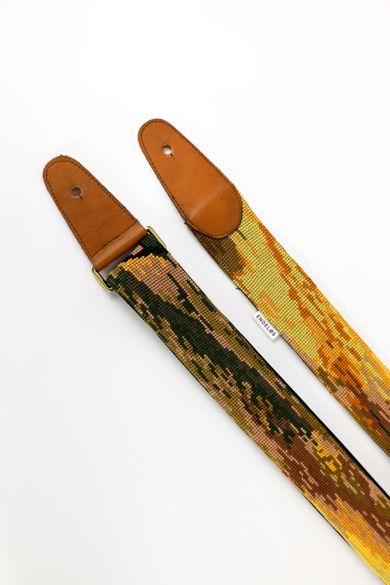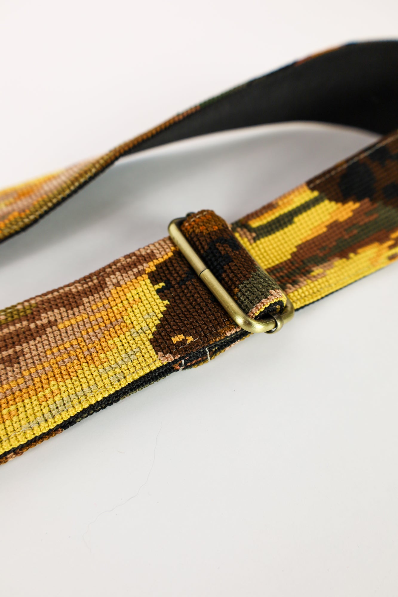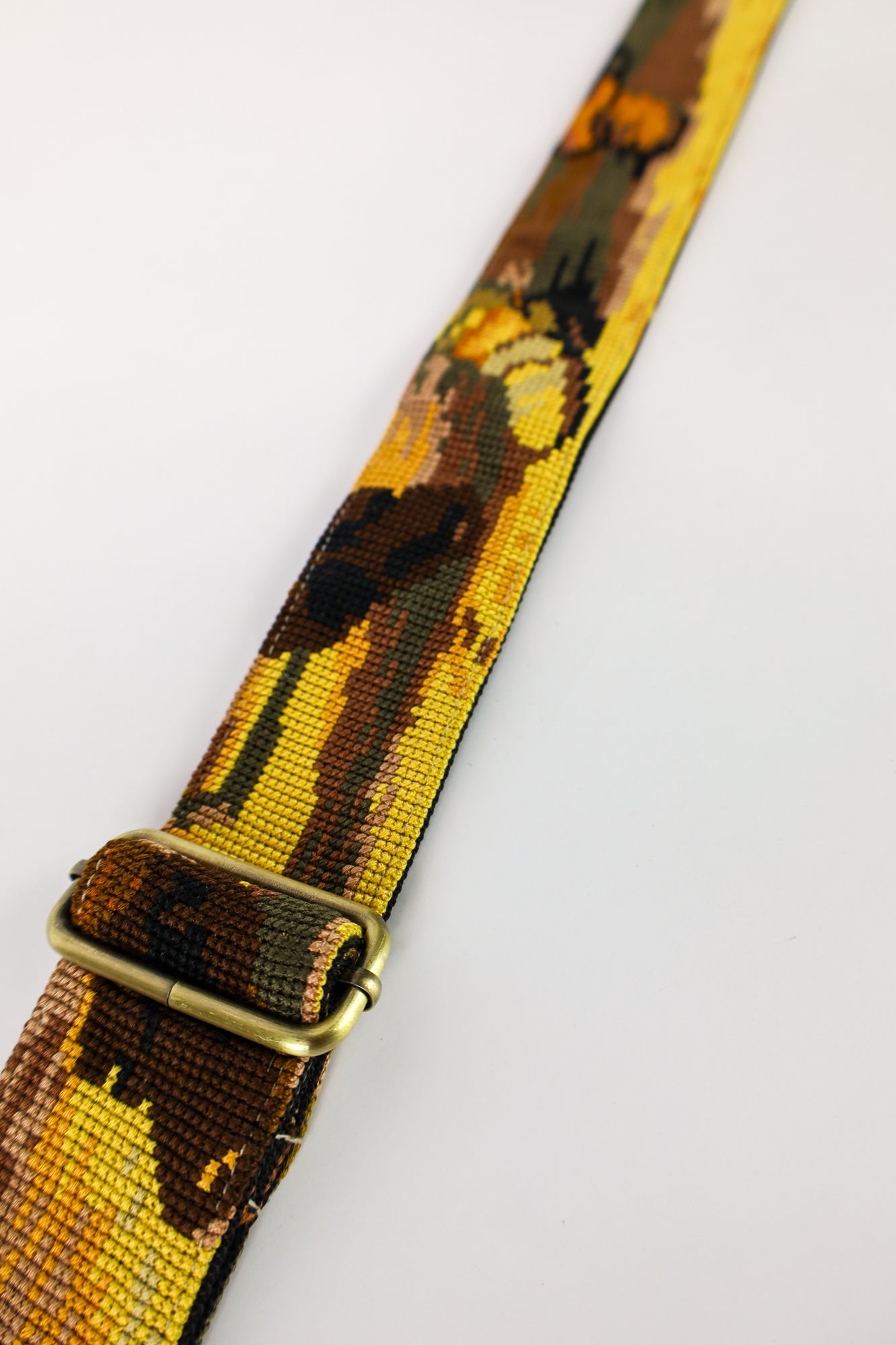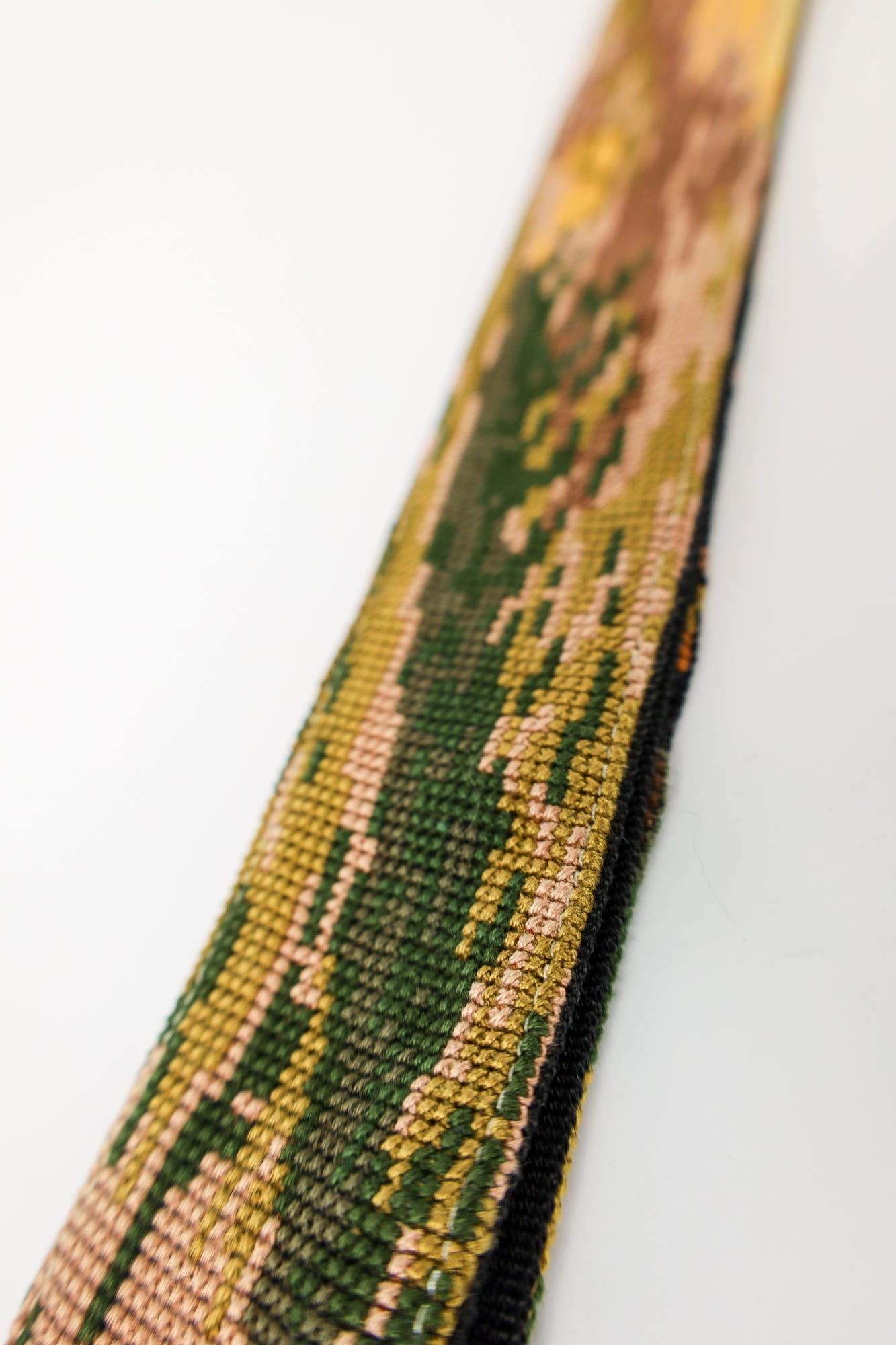 Deze gitaarband is gemaakt van een prachtig kleurrijk geborduurd schilderij, en het kunstwerk is in zijn volle glorie terug te zien in de hele band. Of je nu je gitaar wilt upgraden of een uniek statement wilt maken tijdens een optreden, deze band combineert stijl en functionaliteit op een bijzondere manier. Dankzij het gebruik van hergebruikte materialen is de gitaarband niet alleen duurzaam, maar ook een karaktervolle en unieke toevoeging aan je instrument. Geef je gitaar een persoonlijke, kunstzinnige uitstraling met dit bijzondere en stijlvolle accessoire.