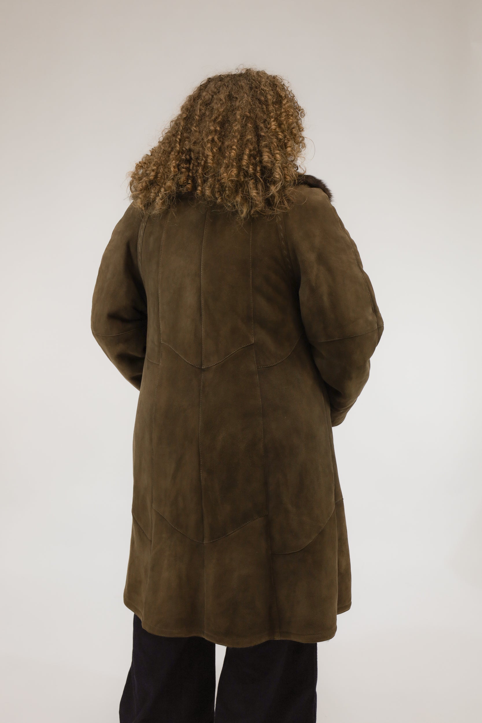 Prachtige vintage shearling coat in een diepe donkerbruine kleur. Gemaakt van soepel leer met een warme, zachte binnenzijde van wol. De jas heeft een klassiek, rechtvallend model met een natuurlijke valling en een luxueuze uitstraling. De zichtbare shearling-randen geven het stuk karakter en diepte. Een tijdloze en warme jas, gemaakt met oog voor detail en kwaliteit.
