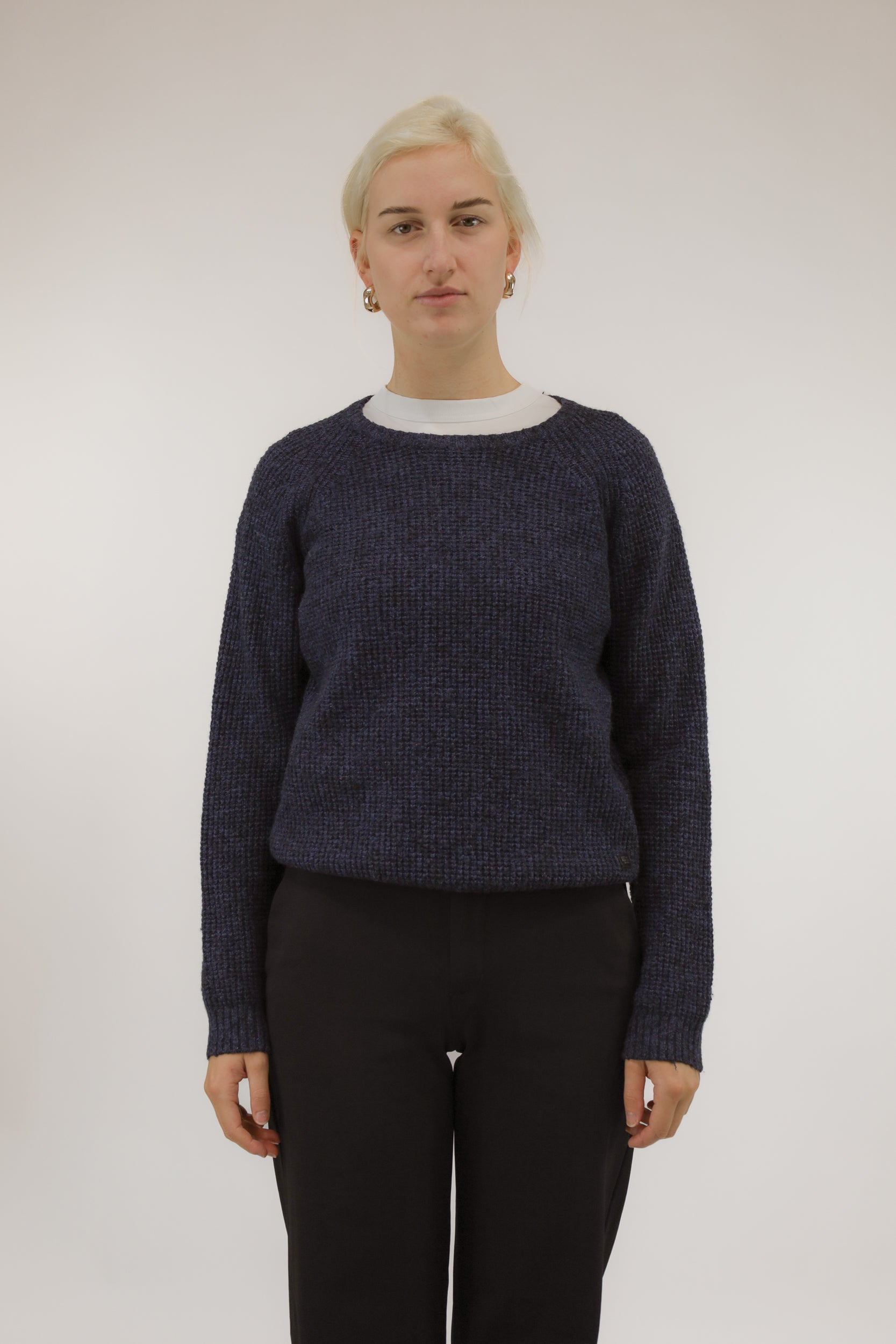 Klassieke vintage trui van het merk Lee in een diepe donkerblauwe kleur. Deze trui heeft een subtiel fijn ingebreid blokjesmotief, wat zorgt voor een stijlvolle, ingetogen textuur.