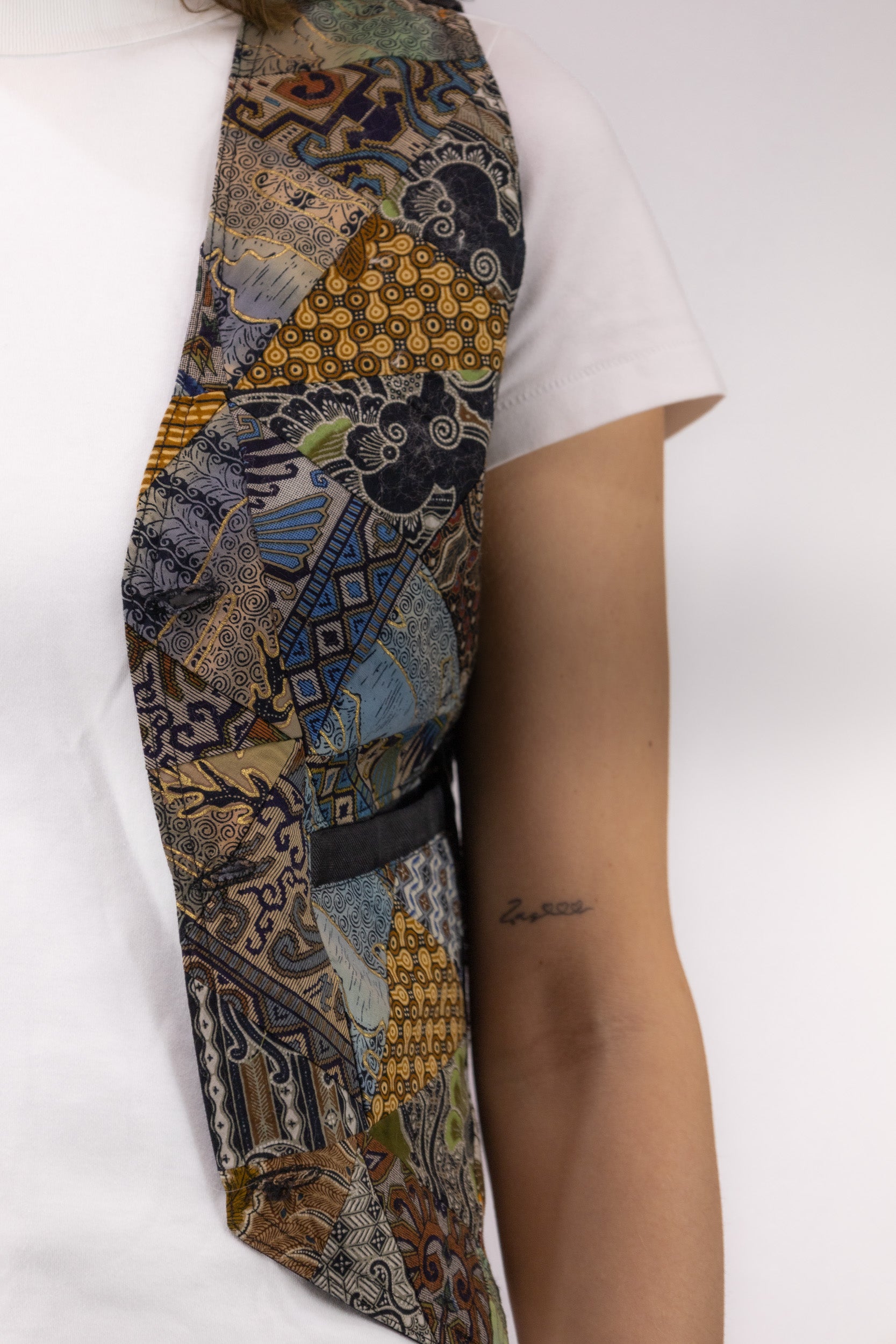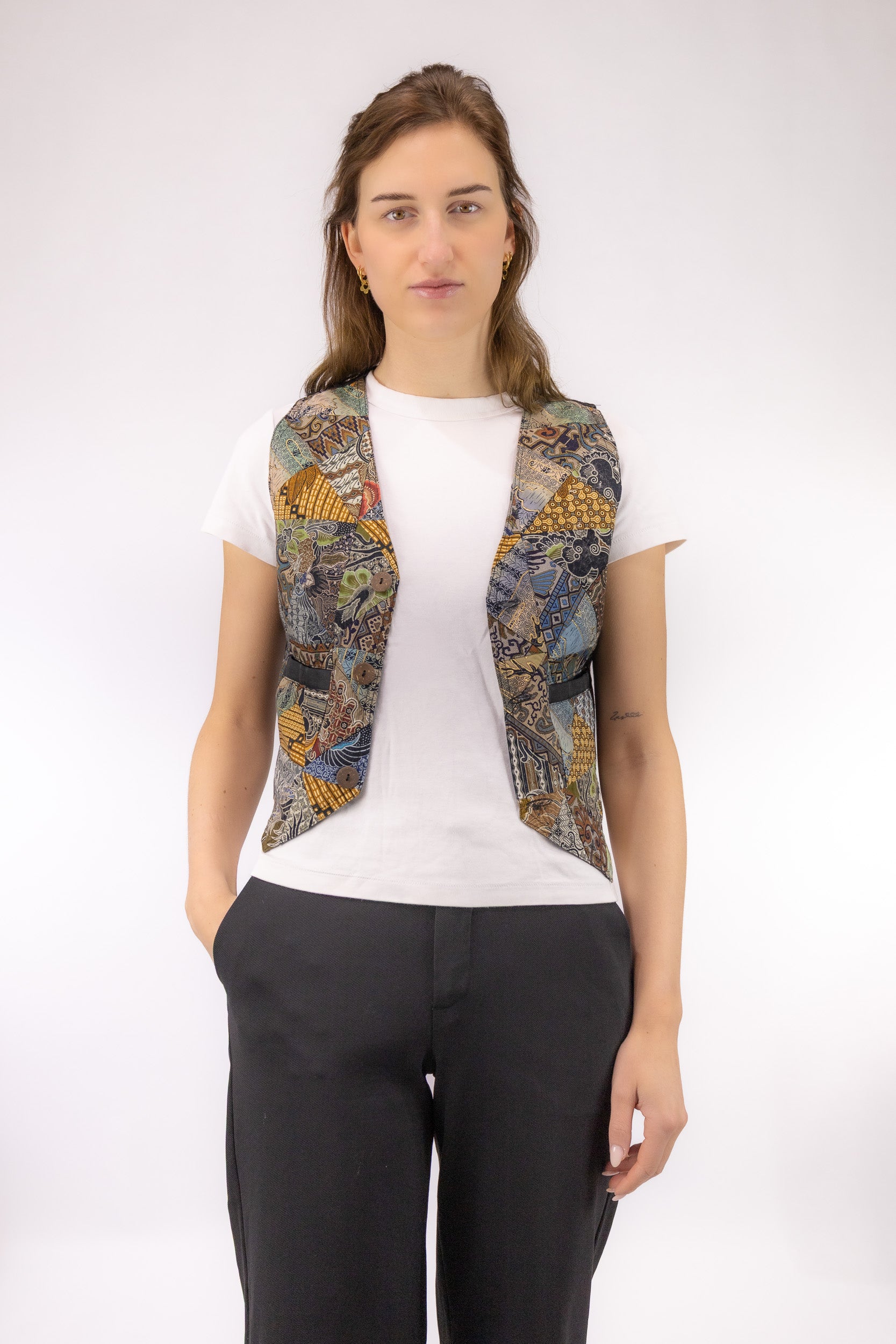 Dit vintage gilet is gemaakt van een bijzondere gequilte stof en heeft een speels patchwork karakter. Verschillende stofjes en patronen zijn zorgvuldig aan elkaar verwerkt, wat zorgt voor een uniek en levendig geheel.