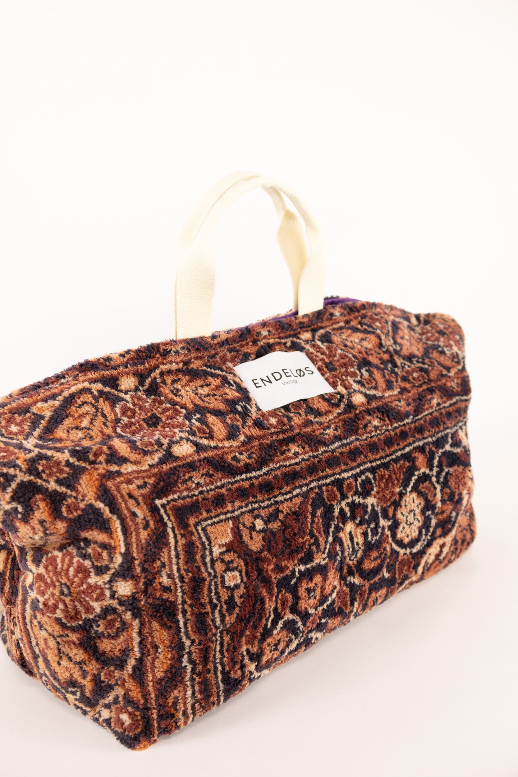 Het rijke patroon van het vintage tapijt geeft de tas een artistieke, bijna schilderachtige uitstraling. Perfect voor liefhebbers van vintage tapijt tassen, handgemaakte accessoires en duurzame mode.