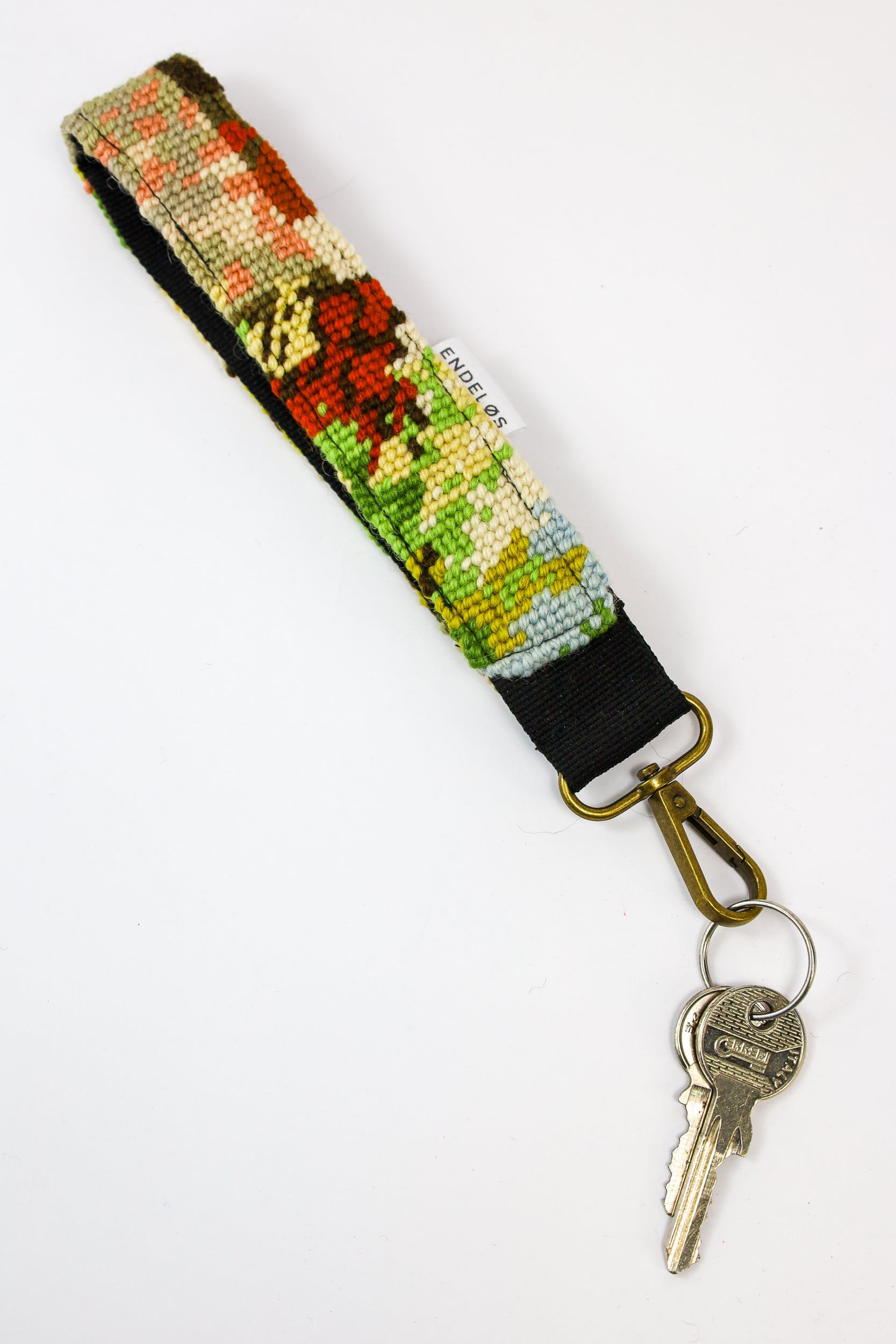 Het bovenmateriaal bestaat uit katoen afkomstig van een vintage geborduurd kunstwerk, wat zorgt voor een karaktervolle en nostalgische uitstraling. De achterkant is afgewerkt met stevig polypropyleen webband, waardoor de sleutelhanger duurzaam en geschikt is voor dagelijks gebruik. De metalen gesp geeft een robuuste afwerking en zorgt voor een veilige bevestiging van je sleutels.