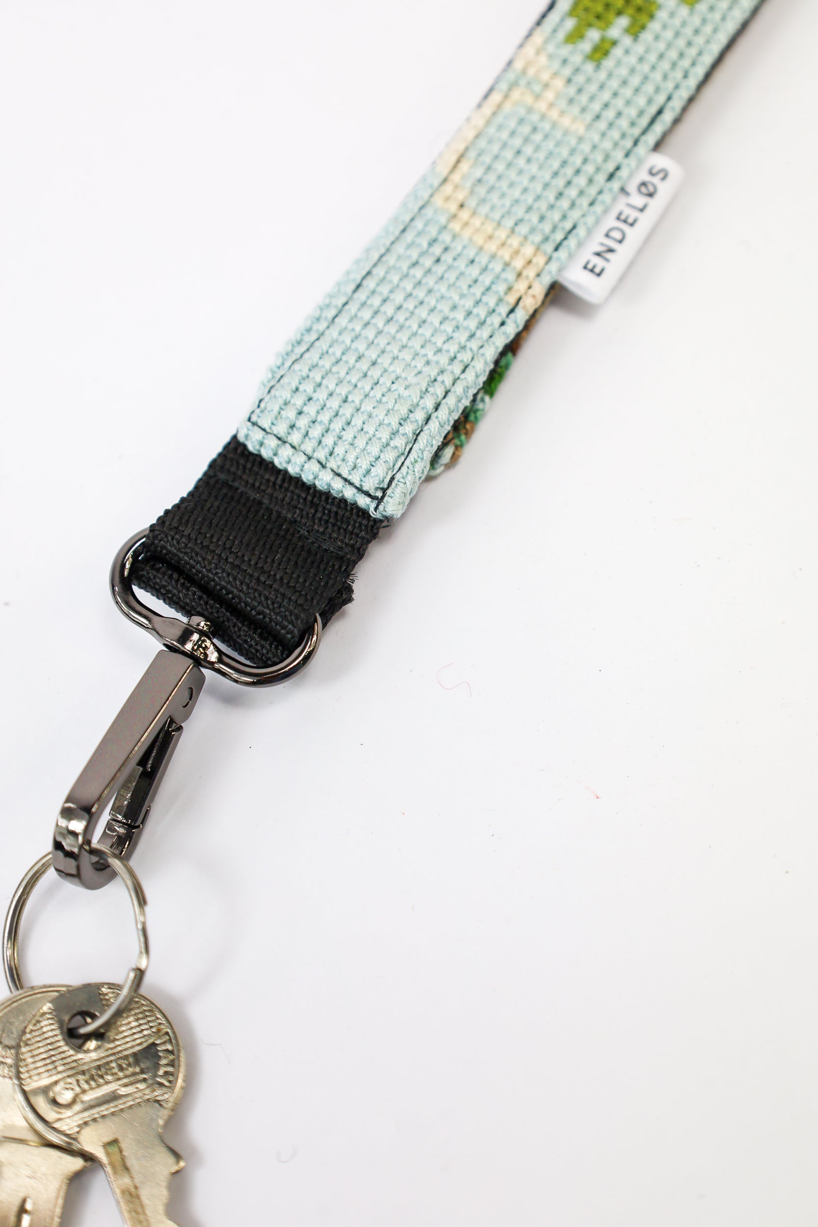 Het bovenmateriaal bestaat uit katoen afkomstig van een vintage geborduurd kunstwerk, wat zorgt voor een karaktervolle en nostalgische uitstraling. De achterkant is afgewerkt met stevig polypropyleen webband, waardoor de sleutelhanger duurzaam en geschikt is voor dagelijks gebruik. De metalen gesp geeft een robuuste afwerking en zorgt voor een veilige bevestiging van je sleutels.